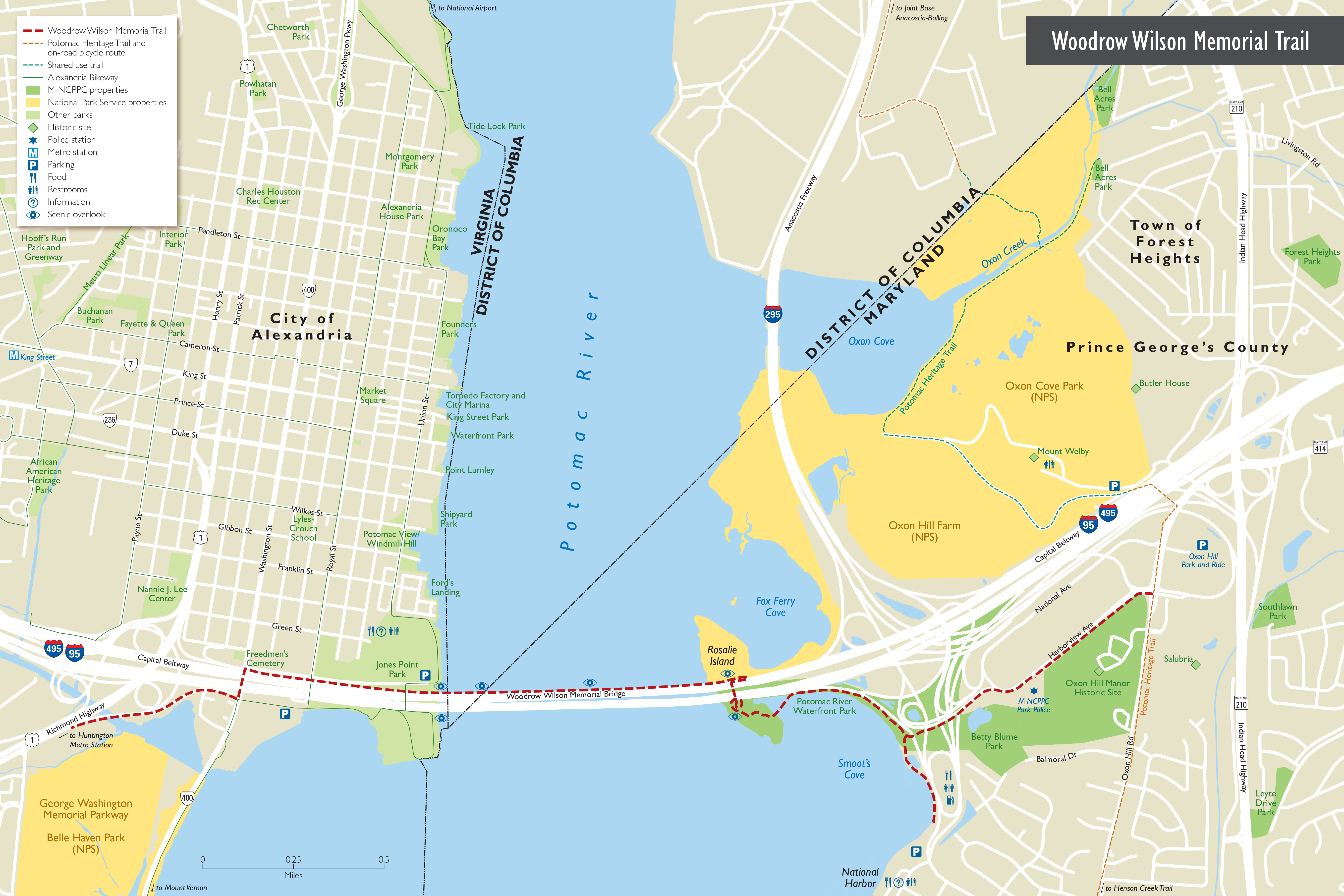 This 3.5 mile trail extends from Oxon Hill Road across the Potomac River to the Huntington Metro Station in Virginia. The Woodrow Wilson Bridge Trail connects to the network of trails in Northern Virginia, including the Mount Vernon Trail.